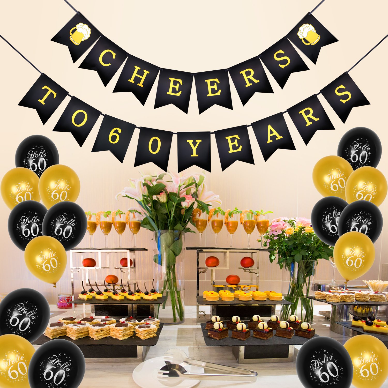 60th Birthday Decorations for Men Women - Happy 60th Birthday Banner Party decorations Cheers to 60 Years Birthday Party Suppiles Black Gold Backdrop for 60th Birthday Decor (71 x 45 inch) 4.7 out of 5 stars. 563. 500+ bought in past month. $9.99 $ 9. 99. FREE delivery Sat, Apr 6 on $35 of items shipped by Amazon.