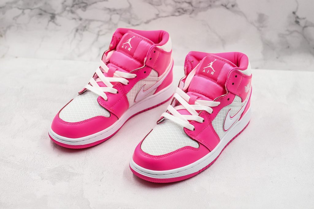 Description. Sporting a vibrant pink design, the Air Jordan 1 Mid Fierce Pink GS puts a modern spin on the '80s basketball icon. Its layered leather upper is accented with Jordan emblems and sidewall Swooshes. Perforations on its toe box allow for ventilation, Air cushioning underfoot offers comfort and its rubber outsole provides grip.