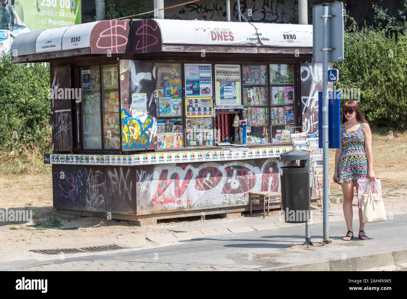 Woman standing reading bus timetable at bus stop outside kiosk, Brno, Czech Republic Stock Photo