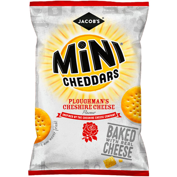 The new Jacob's Mini Cheddars Cheese & Pickle are a baked (not fried) snack made with real Ploughman's Cheshire cheese which is mixed into the dough prior to baking. Made with no artificial colours or preservatives, each bag contains 50g of the Ploughman's Cheshire cheese flavoured Mini Cheddars. Box of 30 bags.