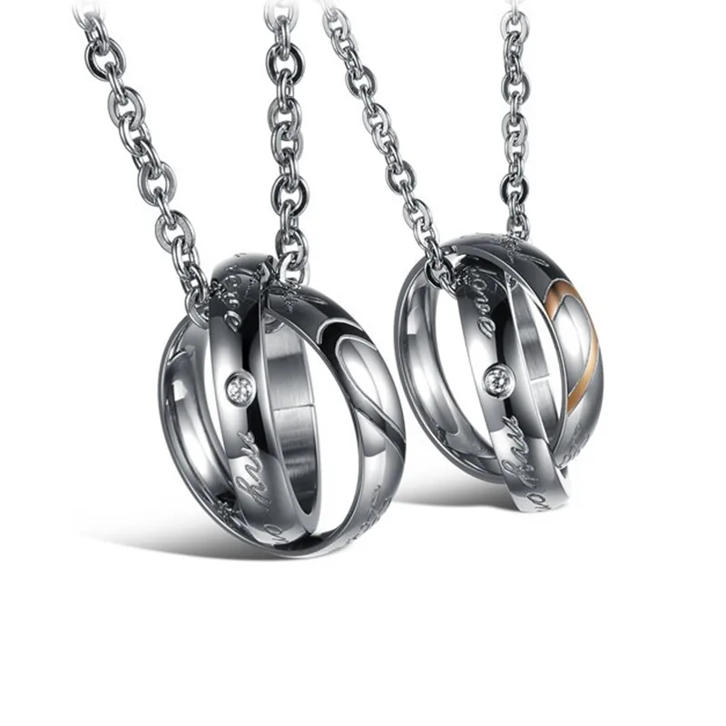 2017 Hot Sale Romantic Double Circle Pendant Half Heart Necklace for Couples Cool Stainless