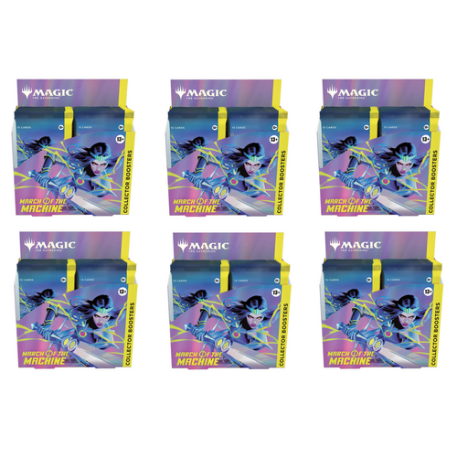 The March of the Machine Collector Booster Box contains 12 March of the Machine Collector Boosters. Each Collector Booster contains 15 Magic: The Gathering cards and 1 Traditional Foil double-sided token, with a combination of 5 cards of rarity Rare or higher and 4 Uncommon, 5 Common, and 1 Land cards.. At least 1 Multiverse Legend card can.