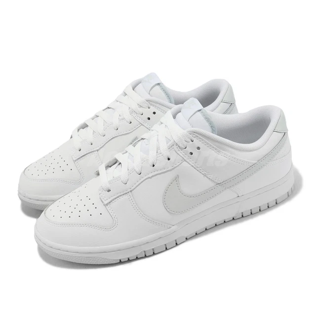 14. $122. 15. $142. Facts. The Nike Dunk Low 'Pure Platinum' gives the hardwood icon a blank-slate makeover, allowing the shoe's classic lines to move to the fore. The low-top carries a white leather upper, accented with a signature Swoosh in pale grey. Heritage details include a perforated toe box and a low-cut padded collar.