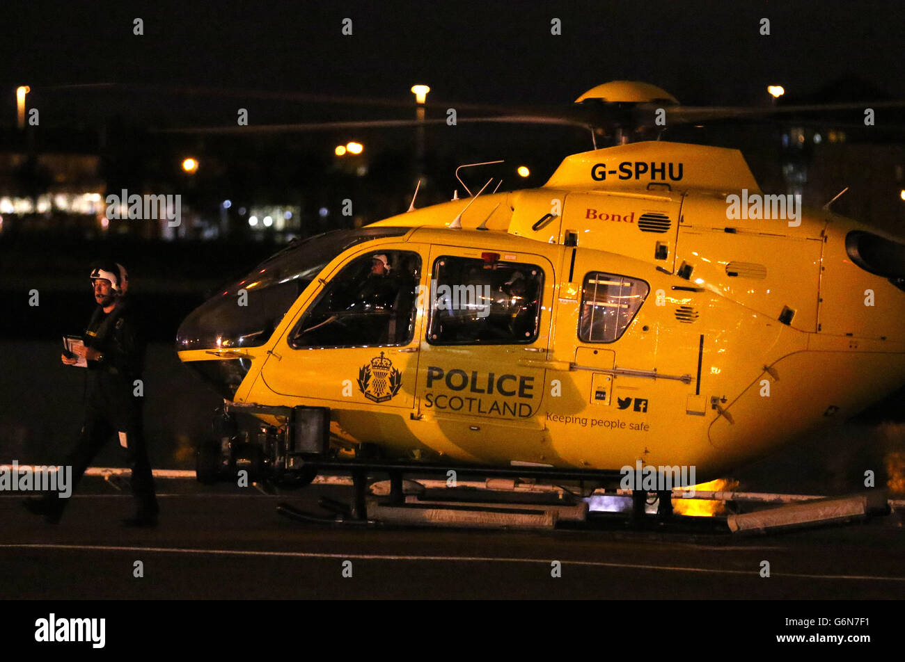 A Police Scotland helicopter prepares to take off from its base at Glasgow City Heliport on the