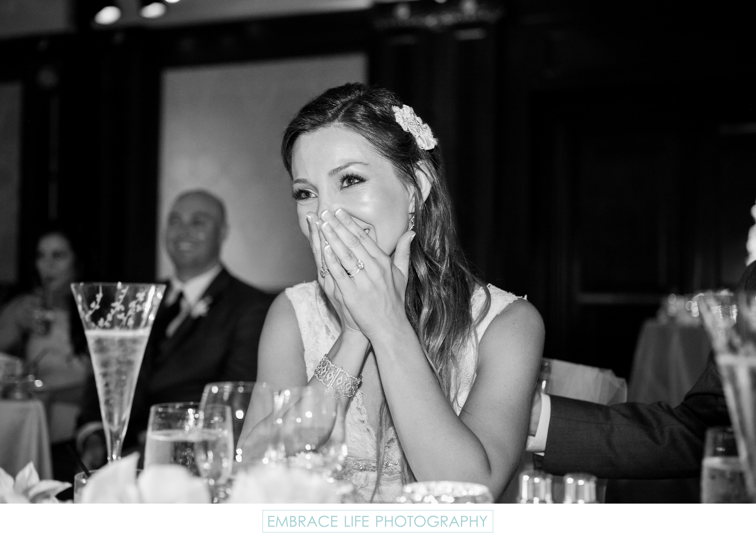 Bride Reacts to Her Father's Toast Four Seasons Westlake Village Wedding Embrace Life