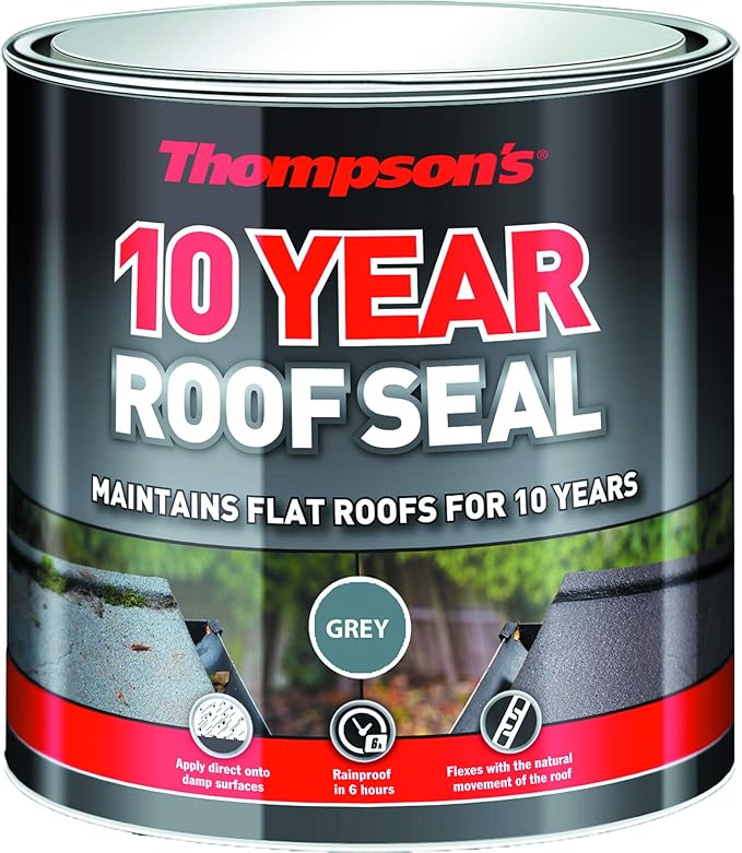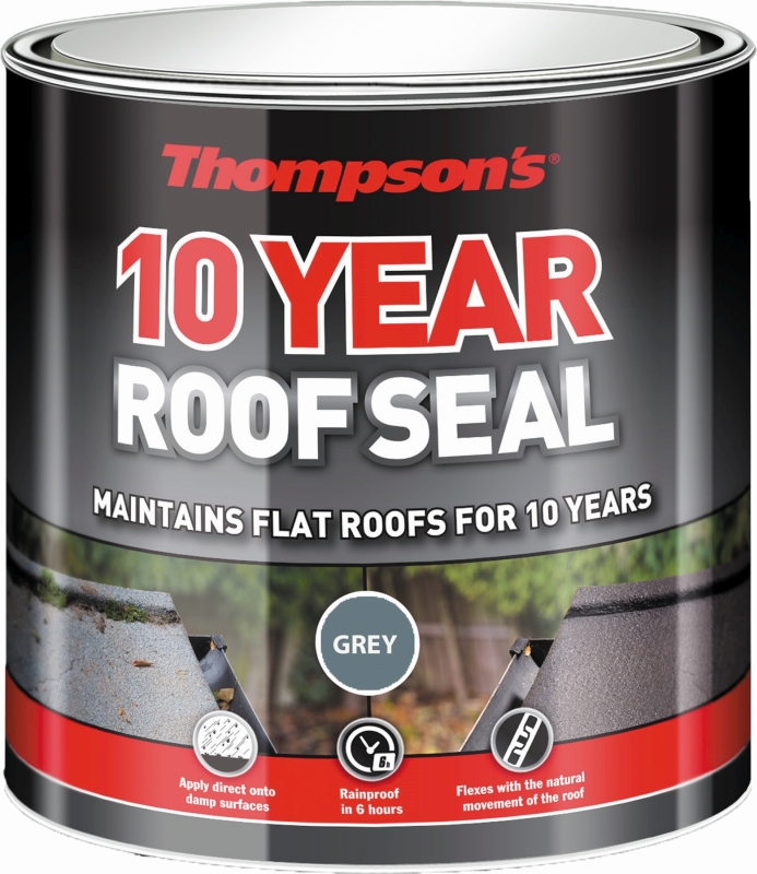 Product information. Thompson's 10 Year Roof Seal flexes with the natural movement of the roof for a long lasting repair, outperforming traditional bitumen paint. The fast acting formula is rainproof in just 6 hours. Instructions for use: On cold, damp days drying and re-coat times will take longer, so for best results, use on a dry day above 10C.