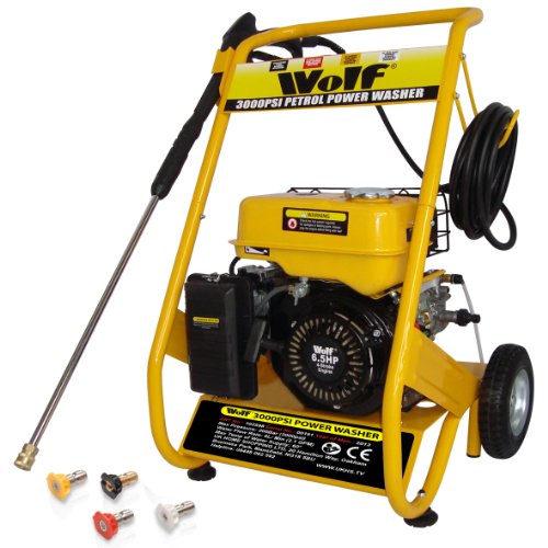 WOLF 200 BAR, 3,000psi, 6.5HP Petrol Pressure Washer. If you were thinking about buying a powerful petrol pressure washer then it's worth considering this pressure washer. Easy to use and powerful, cleaning your garden, driveway or car will be a breeze. Advantages: Versatile, easy to use, durable and powerful. Disadvantages: 6 metre hose.