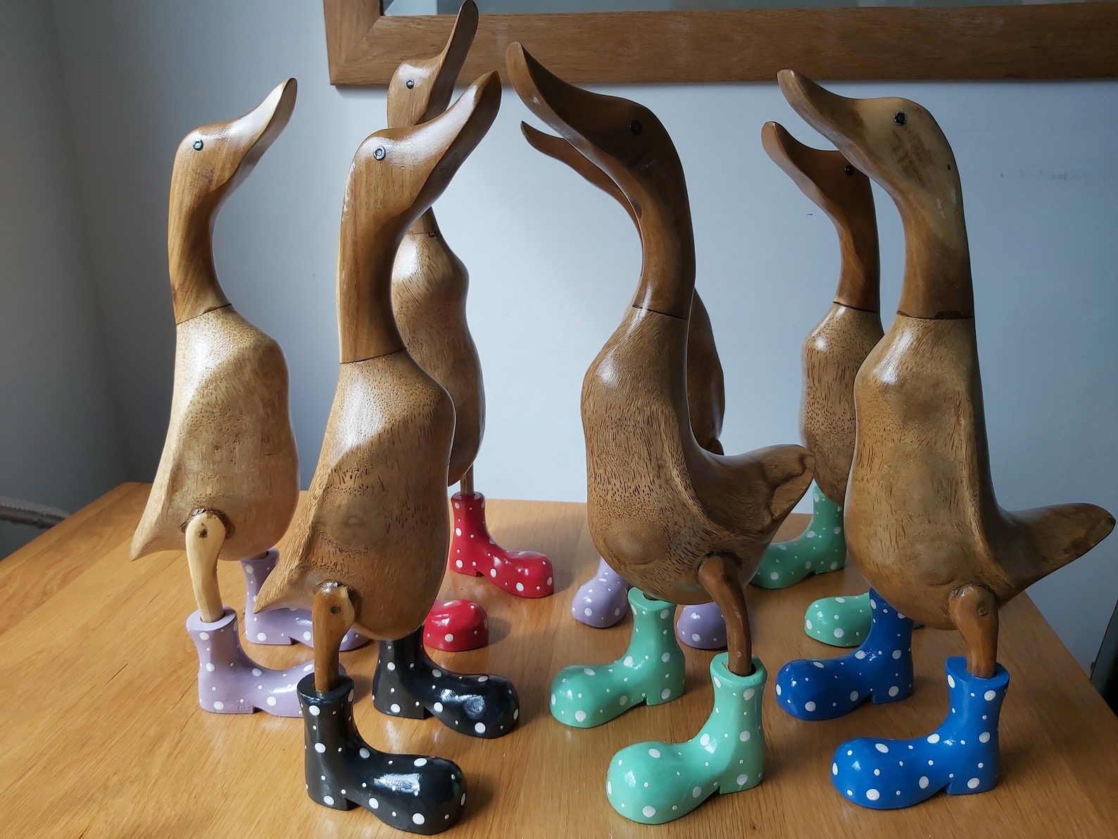 RRP £83.52. Fast Delivery. Get it by Fri 26 Apr. 48. Items Per Page.. 200. Adorable hand-crafted wooden ducks wearing colorful wellies - perfect for the mantlepiece or playroom! Brighten your home with these cute, unique figures!